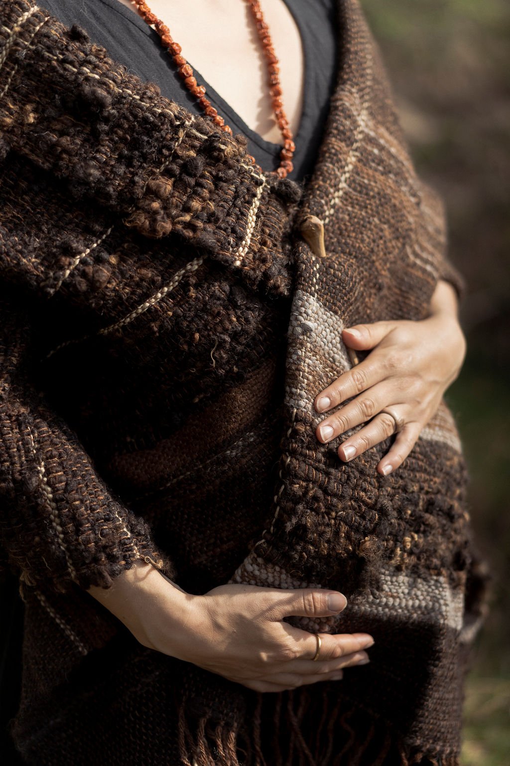 This Shawl marries together regeneratively grazed wool from Fernhill fibre, wild harvested muga silk, Uk alpaca fleece and a woollen warp from the Shetland Islands.