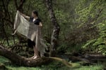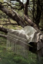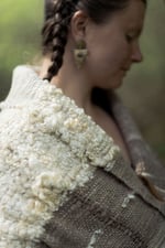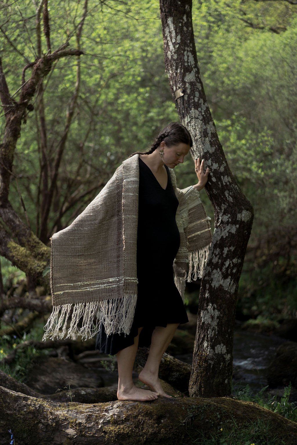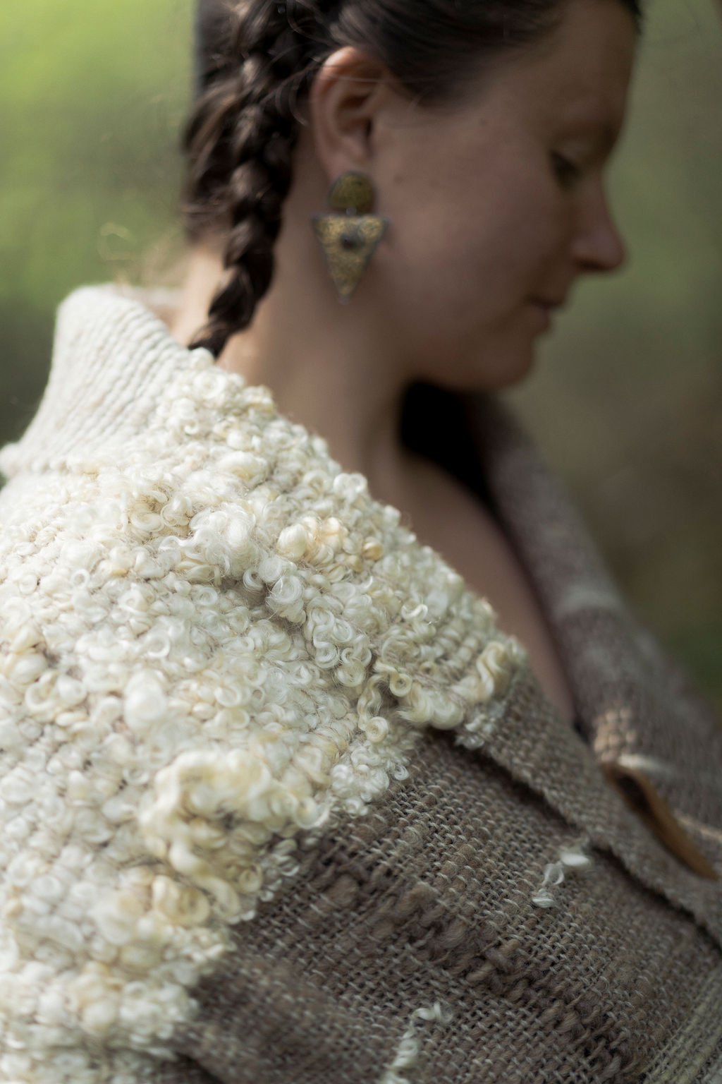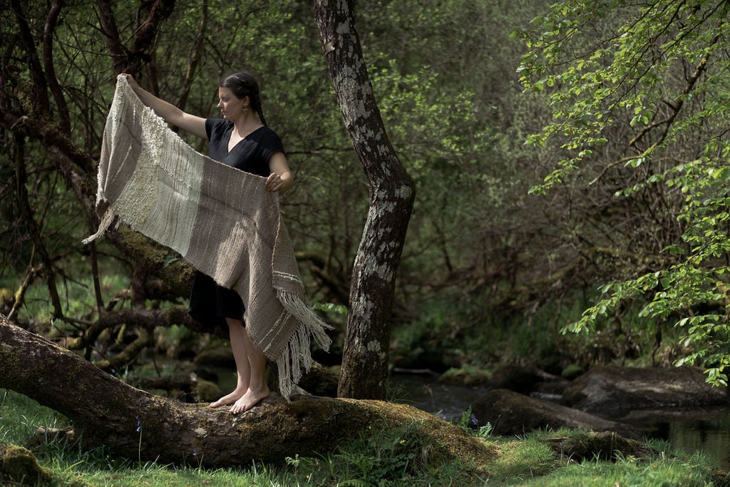 This piece merges a variety of British wools, wild Dartmoor woollen locks, a linen and cotton warp thread and wild harvested muga silk.