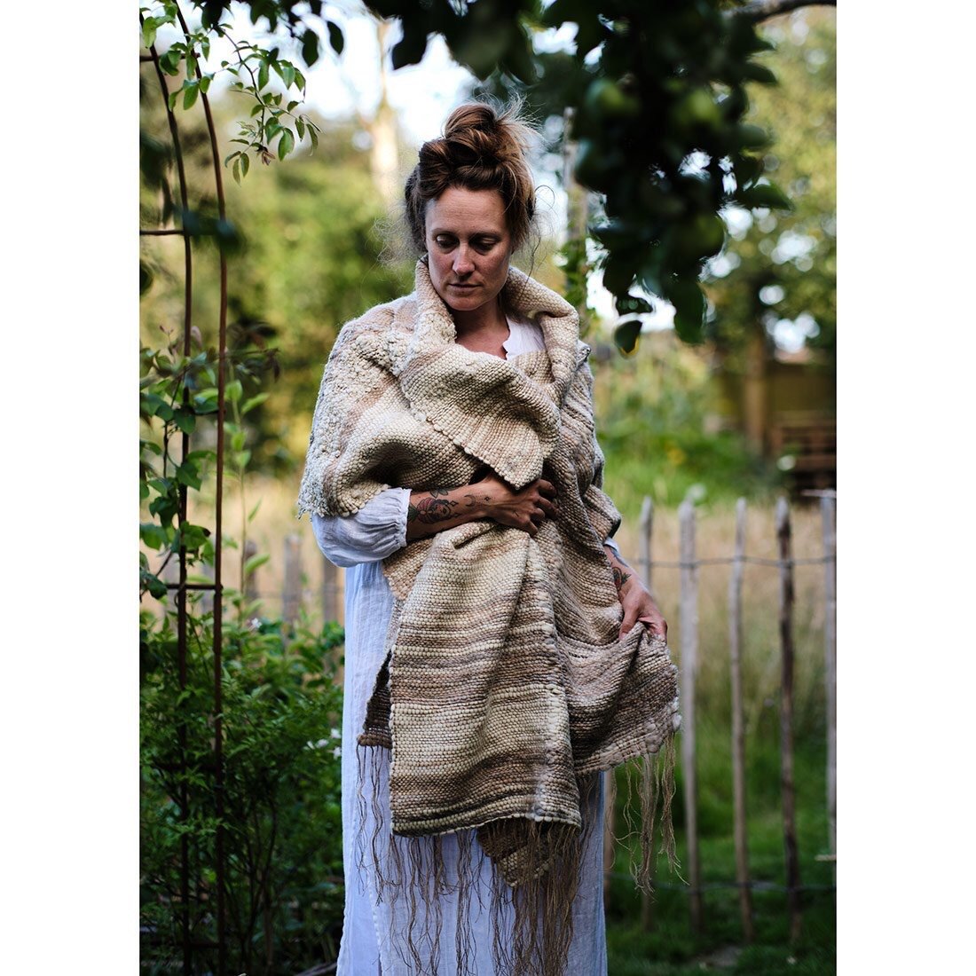 This Shawl is my most recent dance with these energies. It's woven with local and British wools, hand spun linen, a cotton and linen golden warp thread and wild harvested Muga and penduncle silk gathered from a Womens co-operative in India.