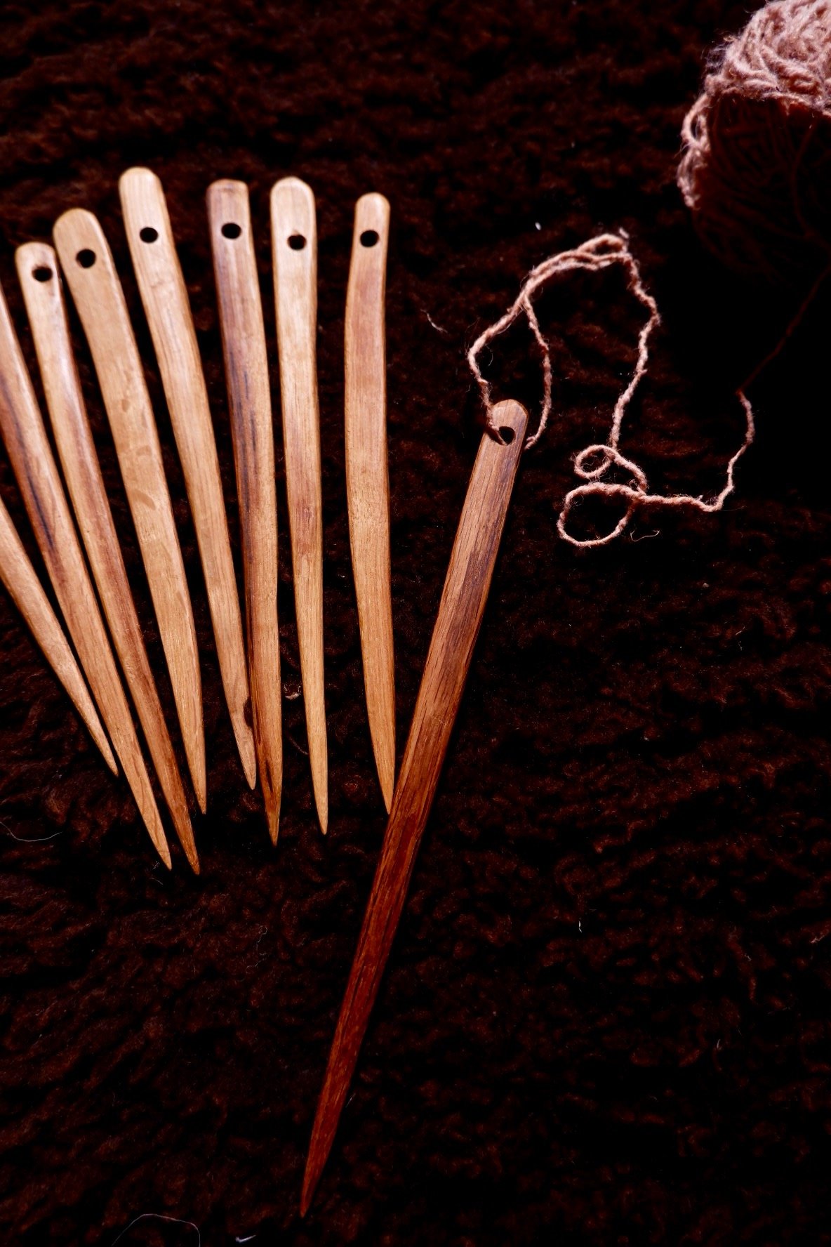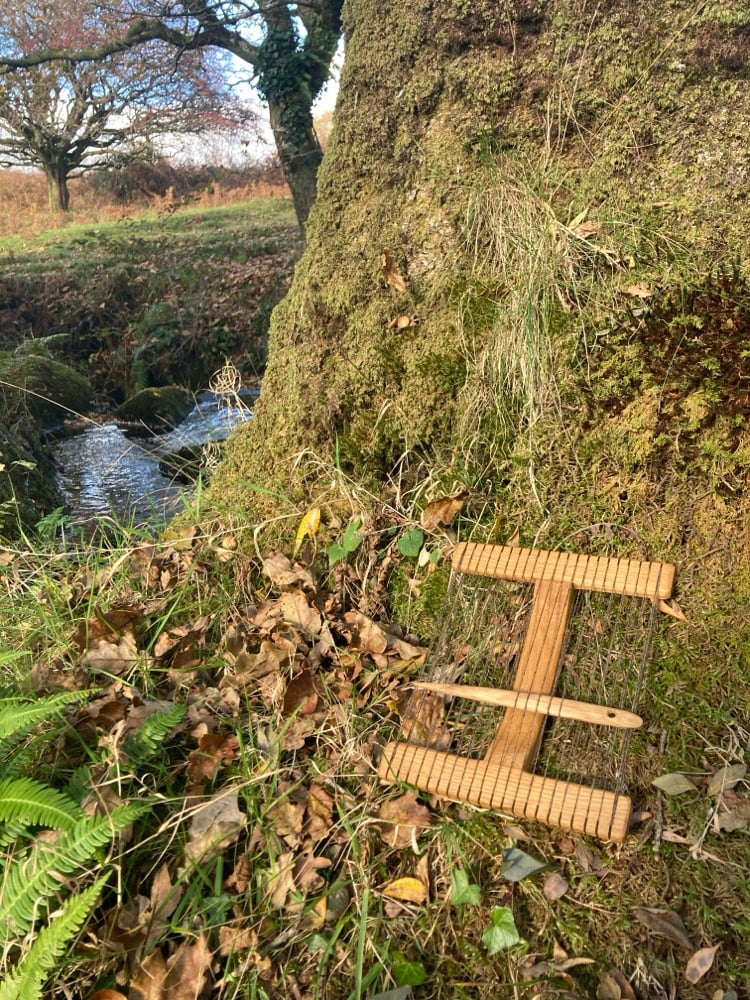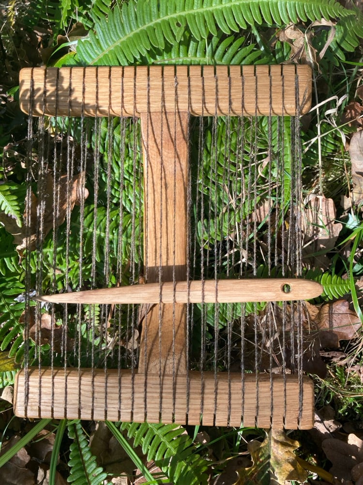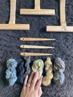 Each kit holds a handmade Devon Oak frame loom and a Devon Oak weaving needle, lovingly shaped by my partner in his moorland workshop.