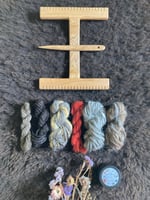 - Complete kit, which includes a surprise gathering of warp and weft threads — each hand-spun and naturally dyed by me here on Dartmoor.