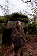 Conjured from the wild locks of regeneratively farmed Fernhill sheep from Somerset, alongside naturally dyed green woollen thread, wild harvested silks and the peat browns of Hebridean fibres, this piece is draped in the essence of the Land.